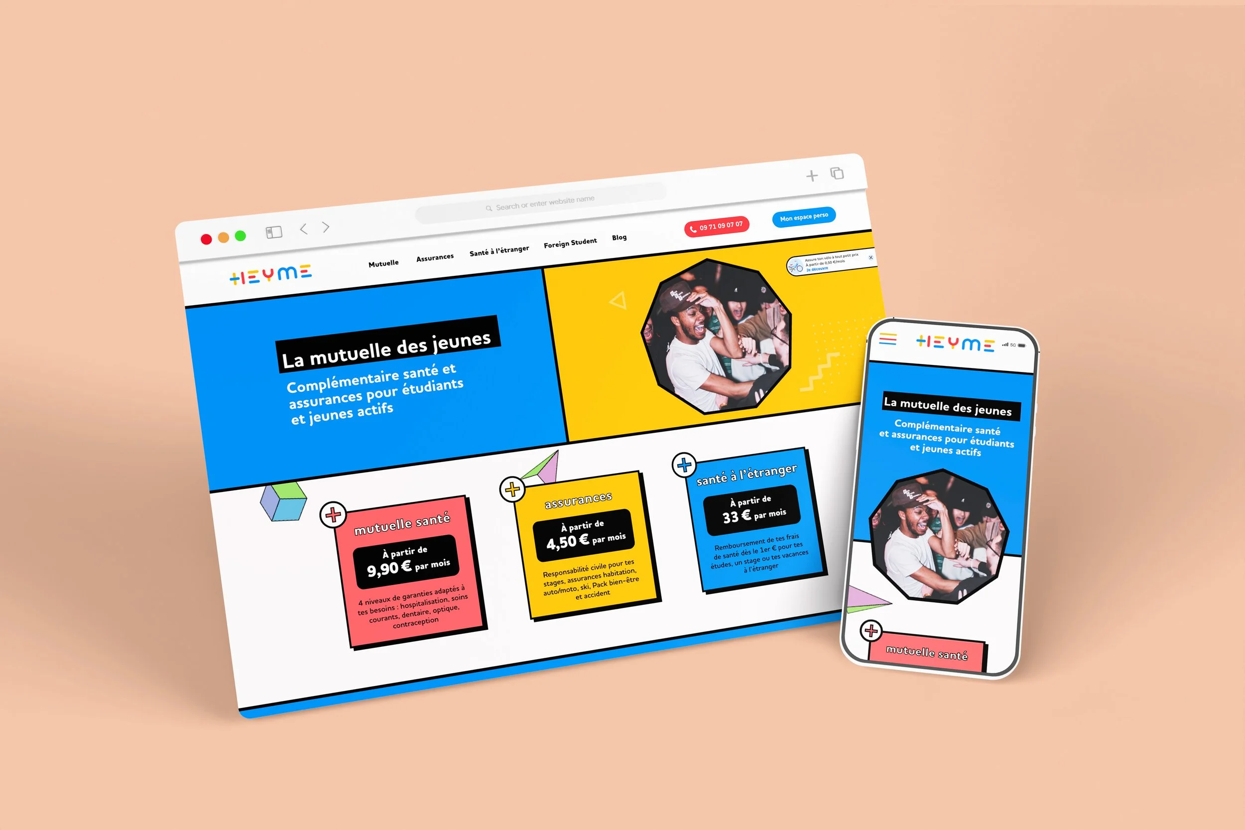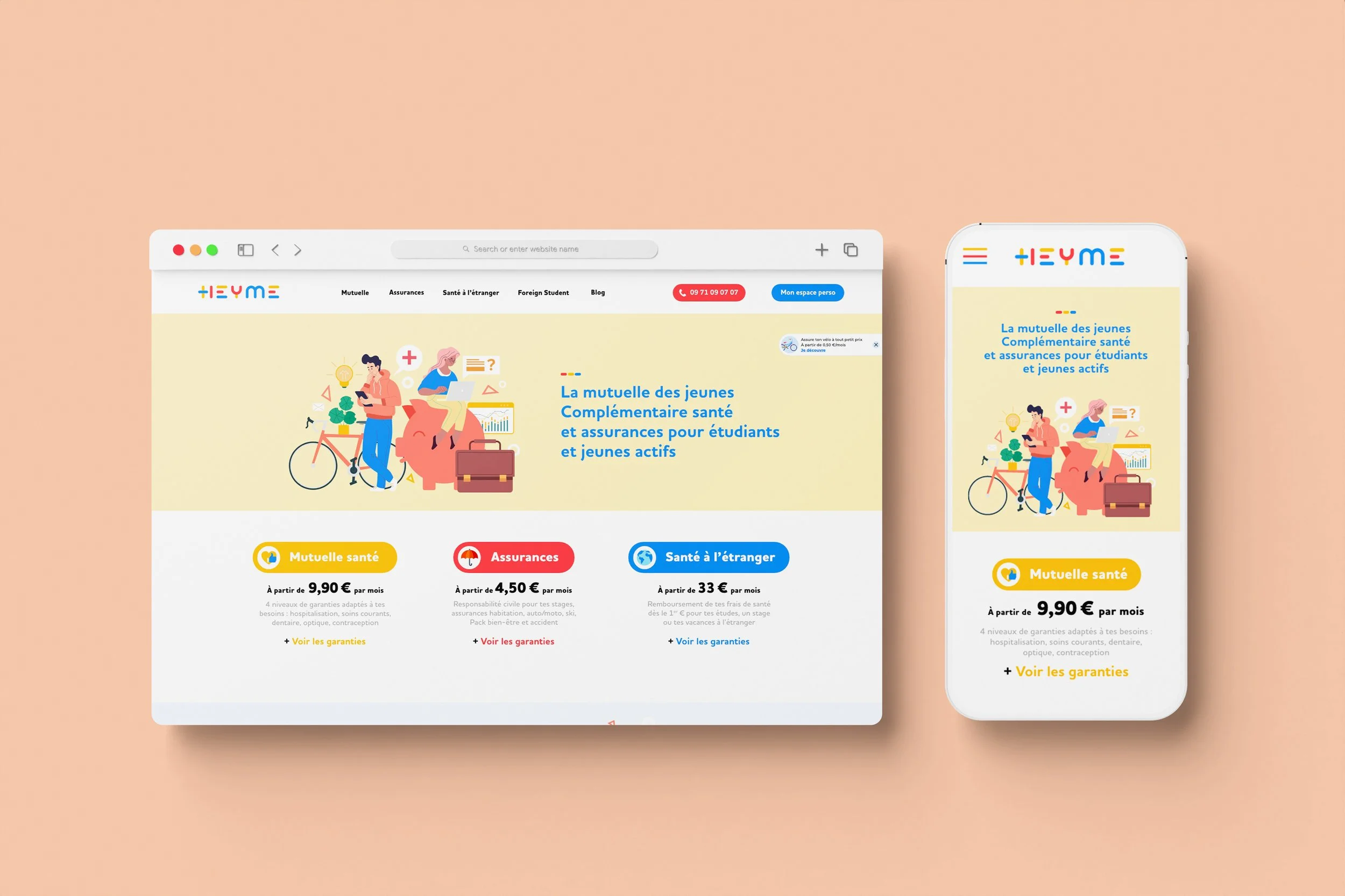 Refonte graphique du site internet HEYME, assurances et mutuelles pour étudiants et jeunes actifs. Le groupe recherche à redynamiser leur image de marque afin d’être plus en accord avec leur cible. J’ai proposé 2 pistes graphiques lors d’un entretien.